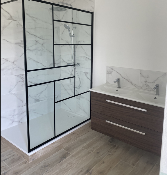 L’objectif était de moderniser une pièce vieillissante tout en optimisant l’espace et le confort. Nous avons procédé à la dépose des anciens équipements, à la mise aux normes du réseau de plomberie, puis à l’installation d’une douche à l’italienne avec receveur extra-plat et paroi vitrée.