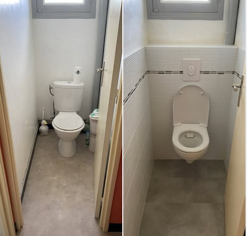 Un meuble vasque contemporain, une robinetterie économe en eau et un nouveau carrelage mural ont été installés afin d’apporter luminosité et modernité à l’ensemble. L’éclairage a également été repensé pour créer une ambiance chaleureuse et fonctionnelle.